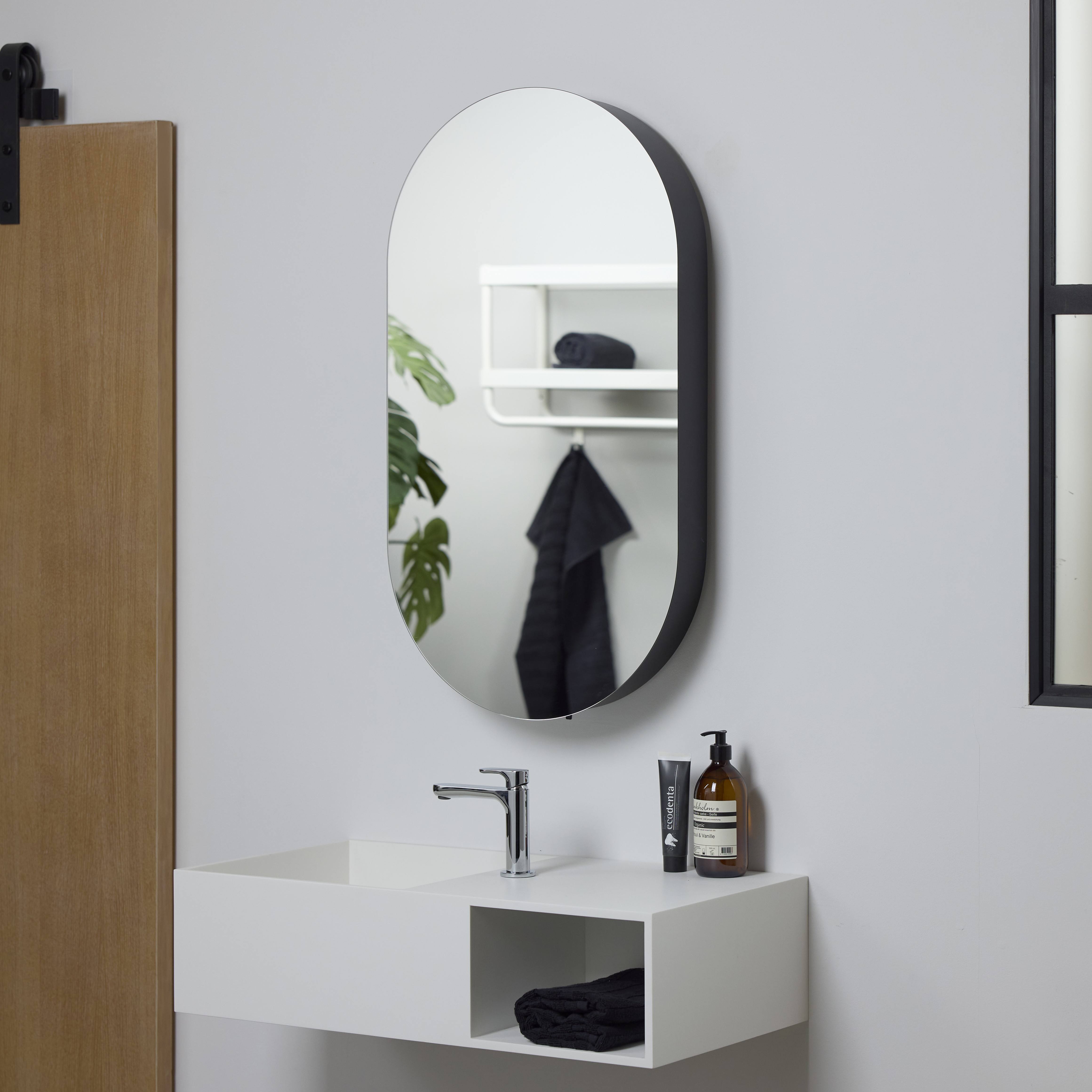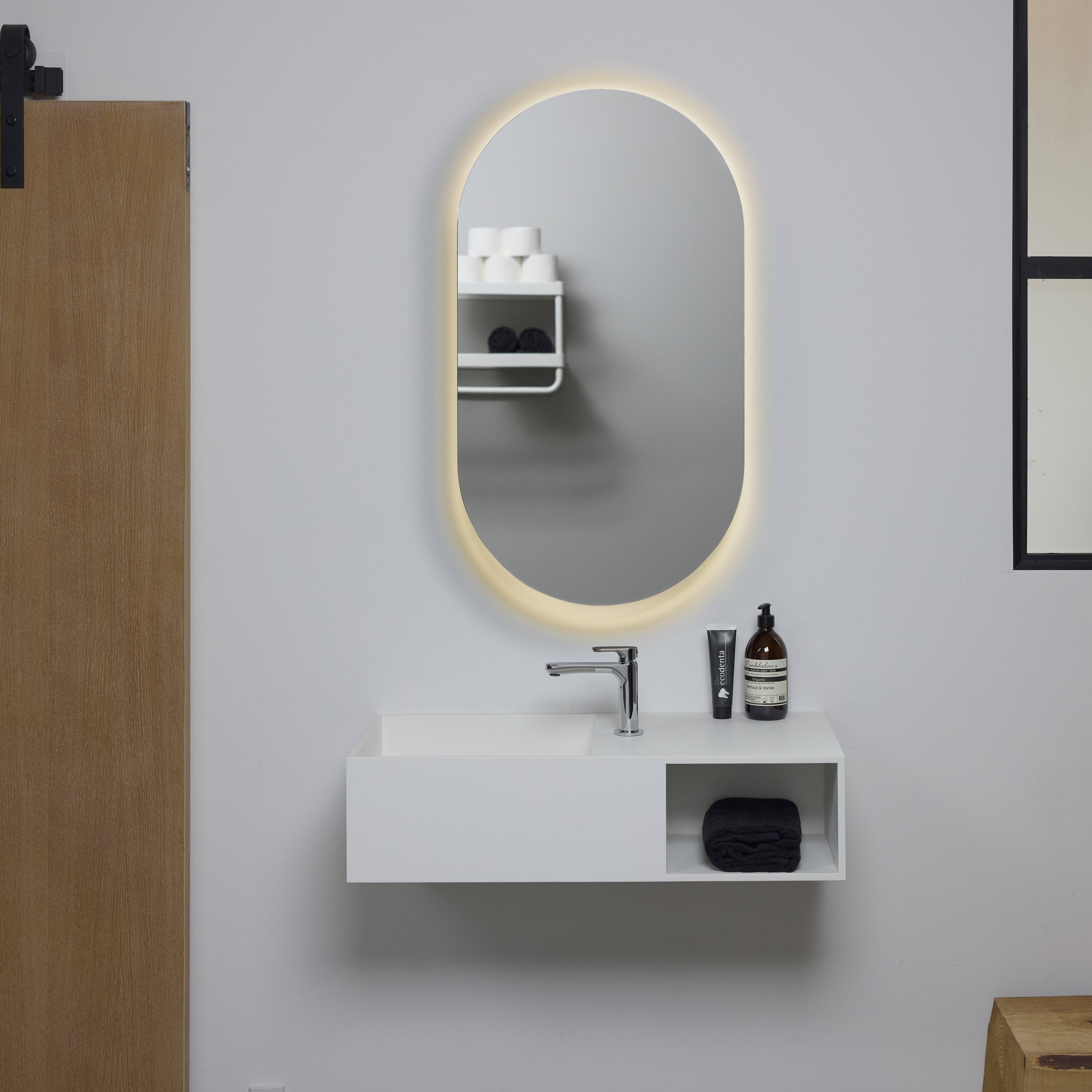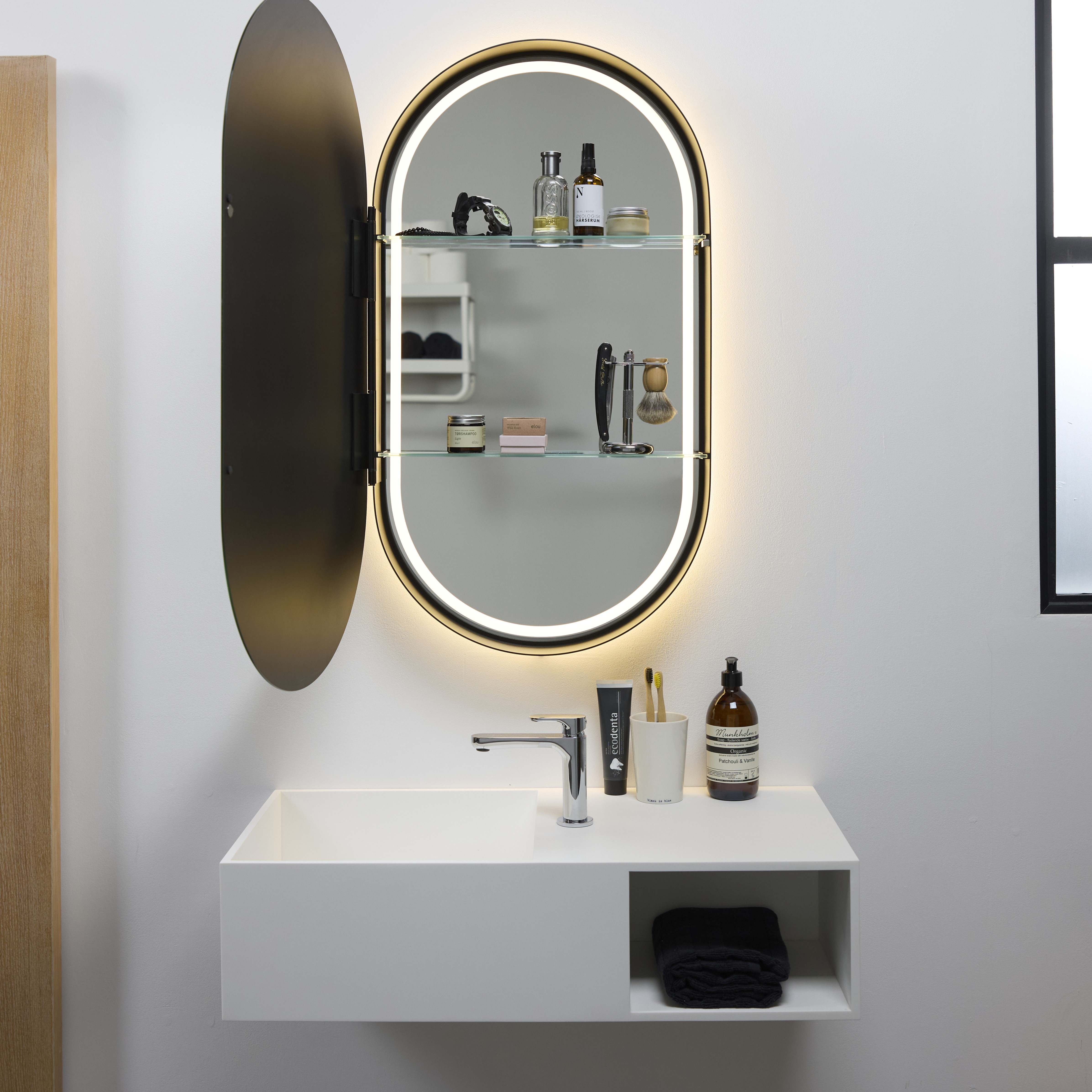 The oval shape gives the mirror cabinet a soft and simple expression that fits in both small and large bathrooms. The integrated light lies evenly along the edge and gives the mirror a floating effect on the wall.