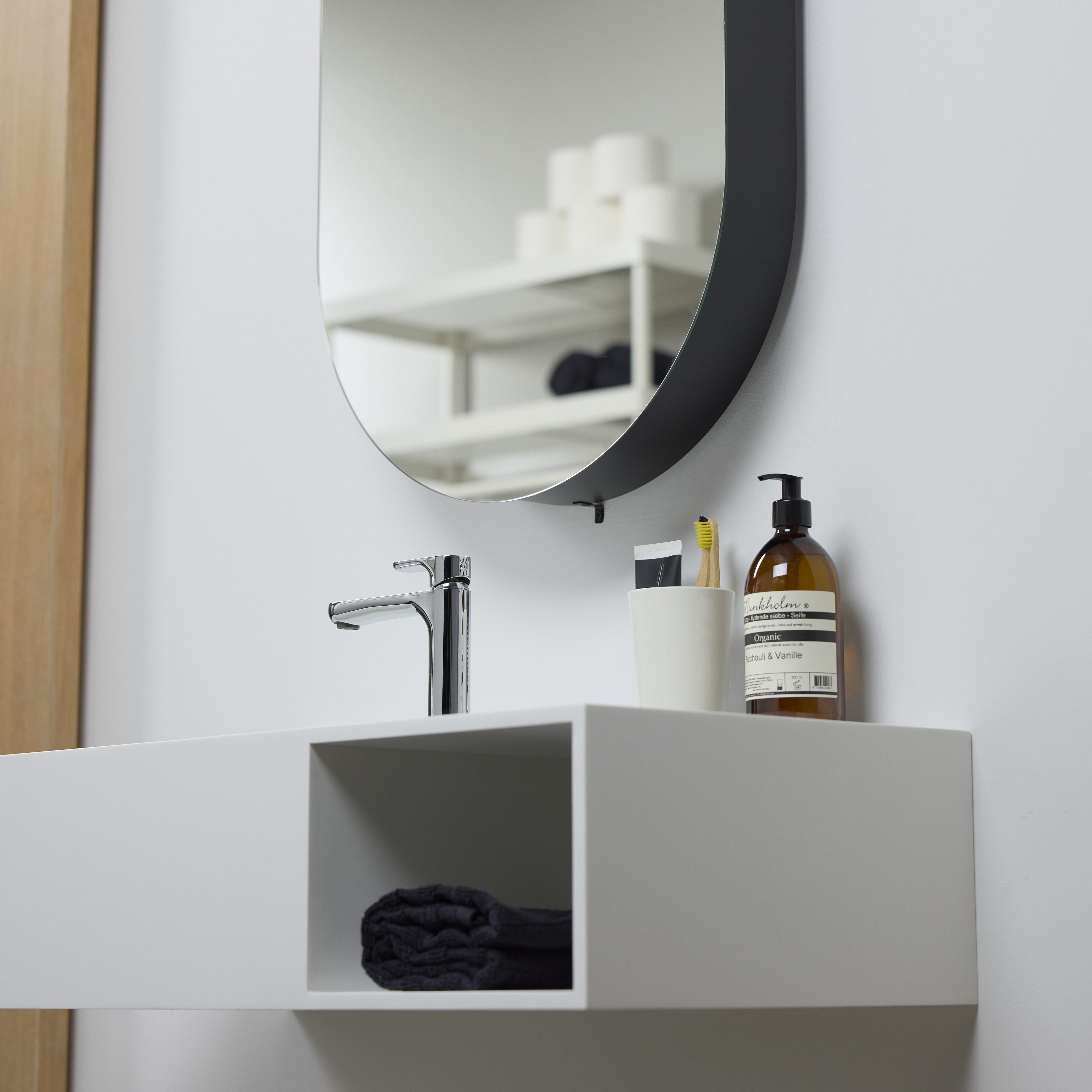 The mirror cabinet is designed to provide extra storage space without taking up unnecessary space in the room - an ideal solution for smaller bathrooms. The two internal shelves provide a good overview of everyday items such as toothbrushes, skincare and accessories, so that the surfaces around the sink are kept tidy. With mirrors on both the inside and outside of the door, you also get a full mirror image, regardless of whether the cabinet is open or closed.