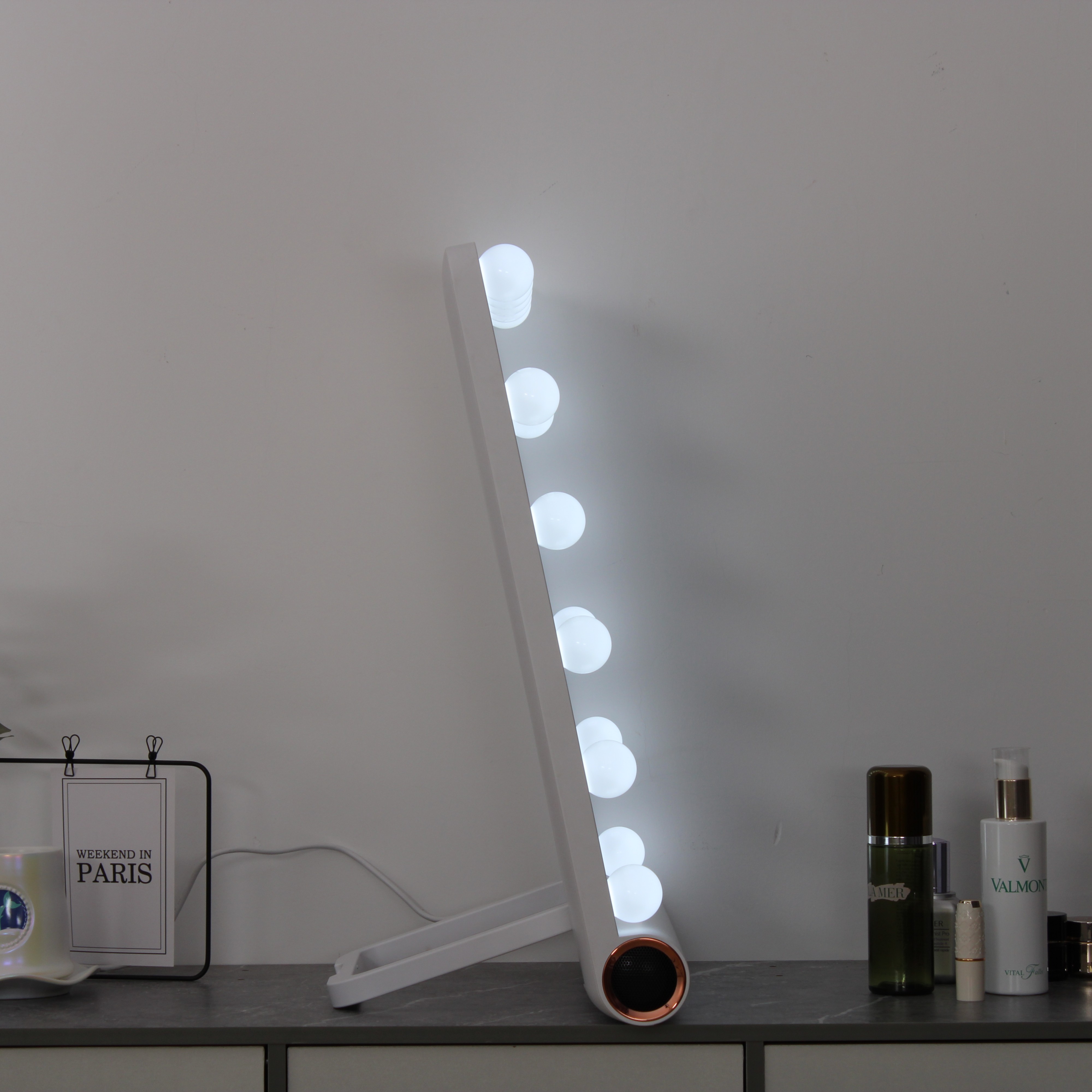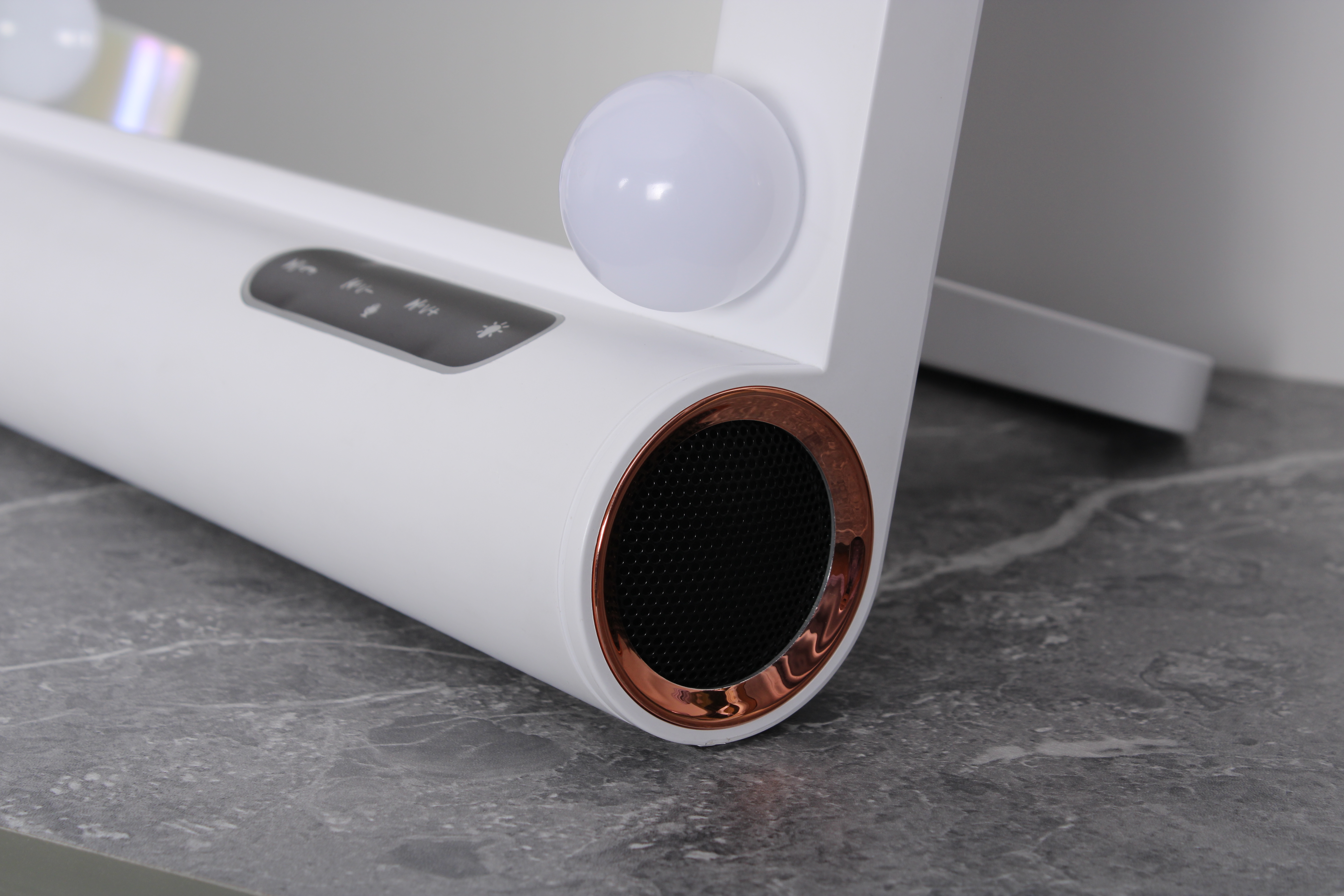 - Freestanding makeup mirror with built-in Bluetooth speaker