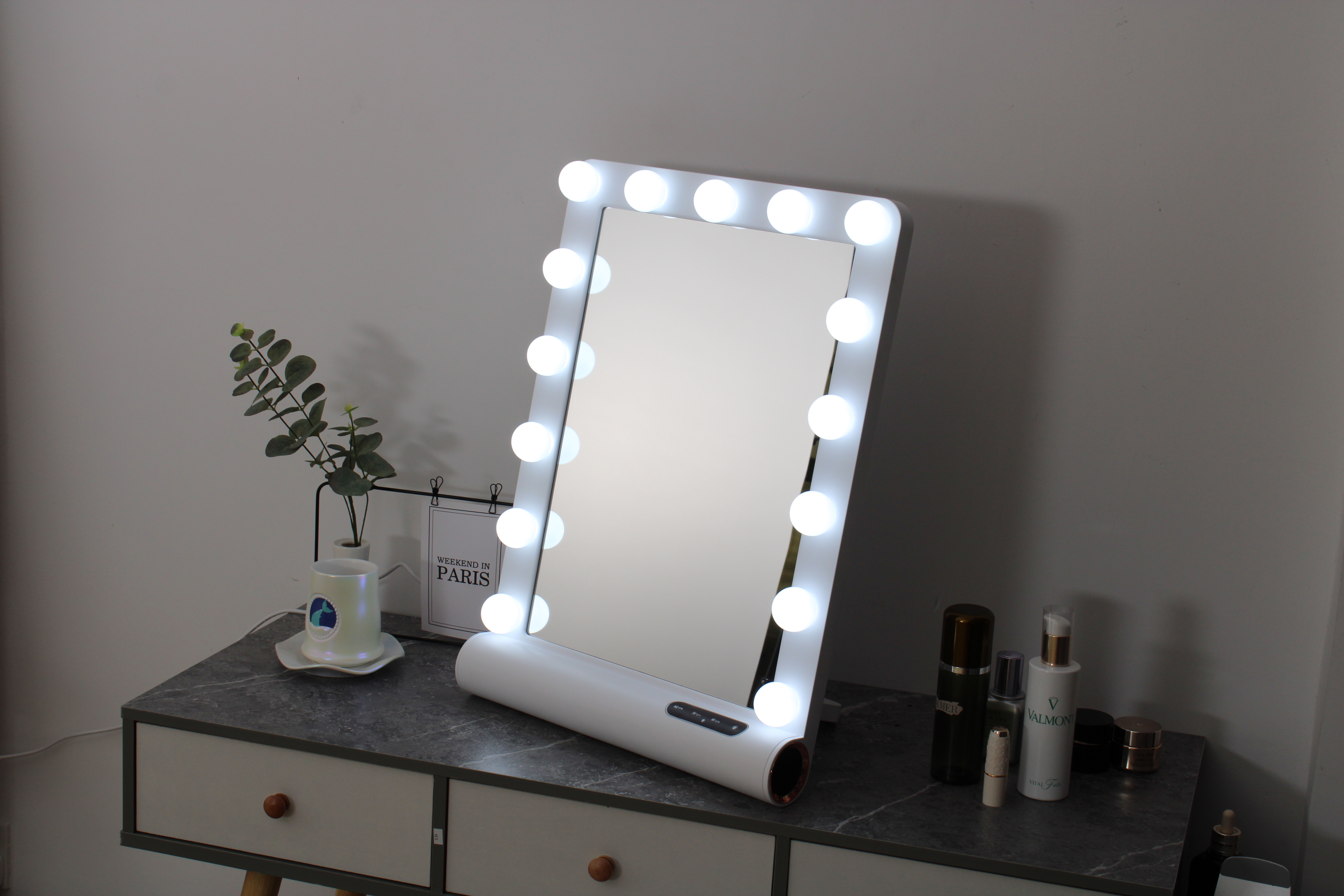 Anna is a freestanding makeup mirror with a classic and decorative design in true Hollywood style that fits naturally on the makeup table. The mirror offers a choice of three color temperatures, warm, neutral and cool white, and the brightness can be adjusted. The combination makes it easy to achieve the right lighting for both morning and evening routines.